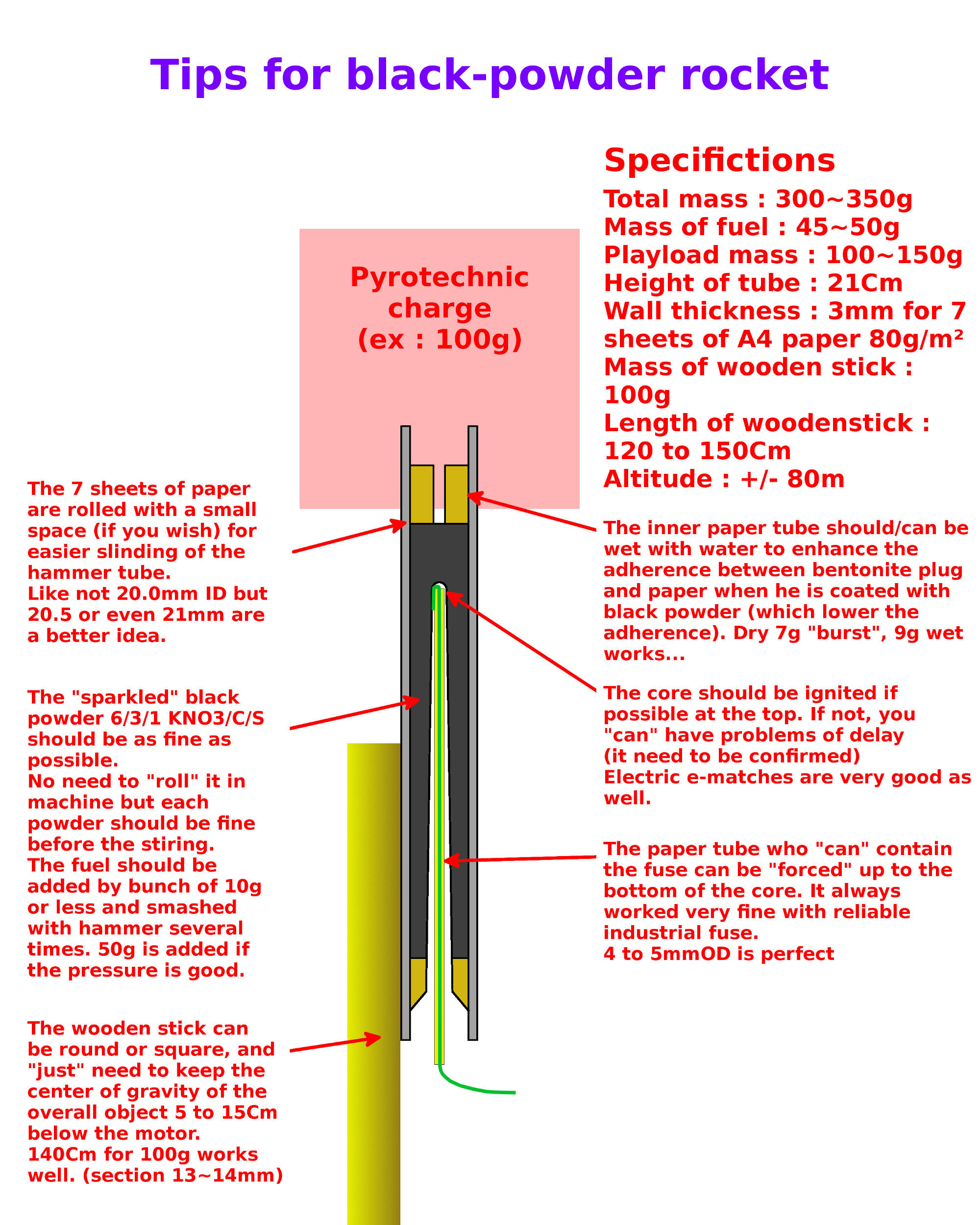 – Black powder fuel 1/3/6 in weight with : Sulfur : 1 Charcoal : 3 KNO3 (salpeter) : 6